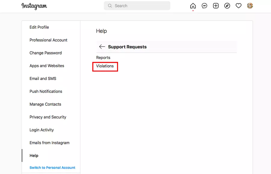 To see if there are any reports on the account, go to the Support Requests and Violations section.