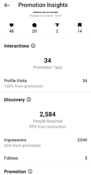 Now let’s talk about statistics during a promotion. To promote a post, you need to click the Promote button. Here the statistics are slightly different: it counts what percentage of coverage or actions advertising brings and which part of it is organic. You can see the detailed information about the audience for both your account and promotion — to whom the advertisement was shown and who reacted. You can see where the people who interact with the ad are from, what age and gender they are.