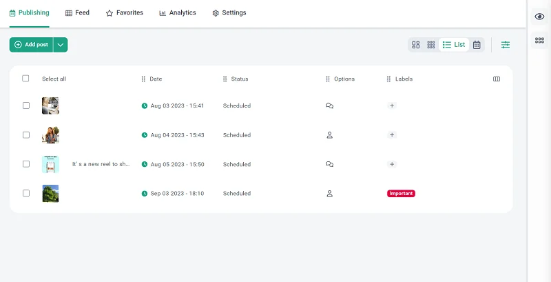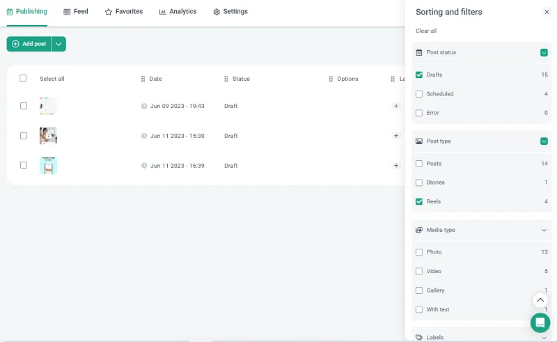 With the help of filters, you can choose which posts will be displayed: scheduled, drafts, or posts with errors. With the Media view filter, you can see all posts with photos, videos, or publications with text in one click. On the main list, post types are visually distinguished by icons.