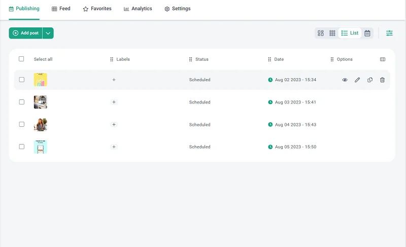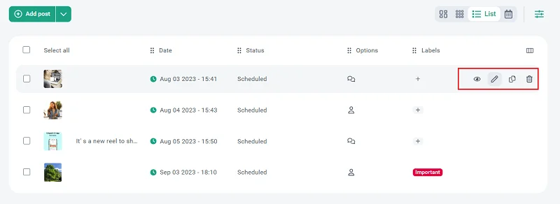 In addition, the platform has a helpful feature — actions with posts. You can view, edit, copy, and delete posts from one window. On the List layout, this column appears when you hover over a post.