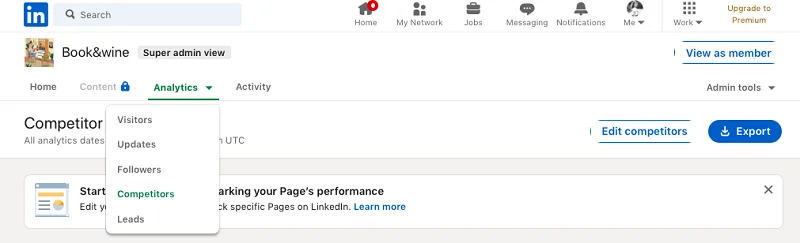 The platform functionality allows you to edit the competitor list to track specific pages on LinkedIn. To do this, go to the Analytics tab, then — Competitors.