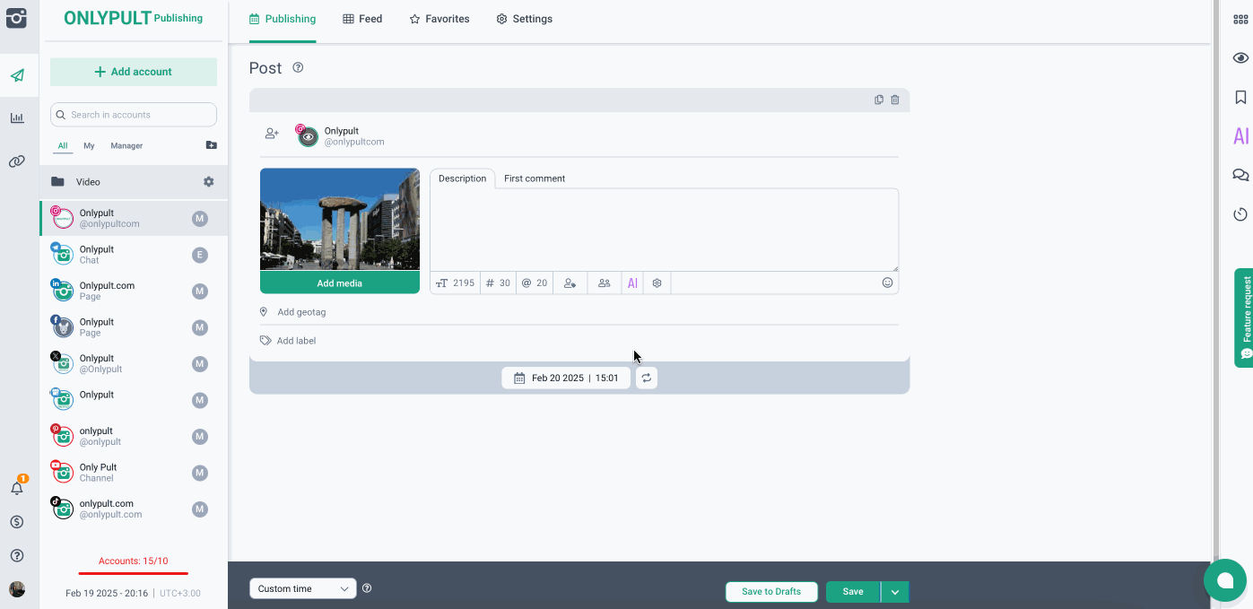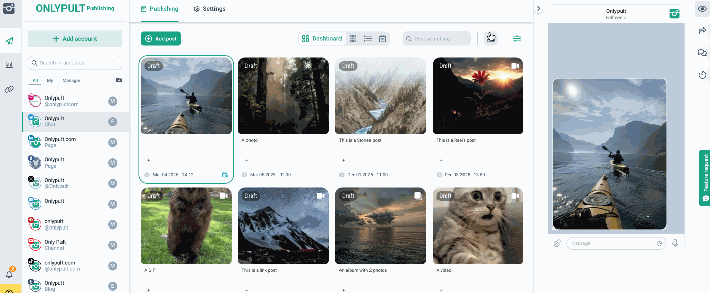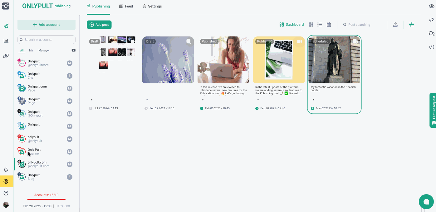 After this, posts will automatically appear in the system, where they can be edited: add text, geolocation, links, copy to other accounts, and use other platform features.