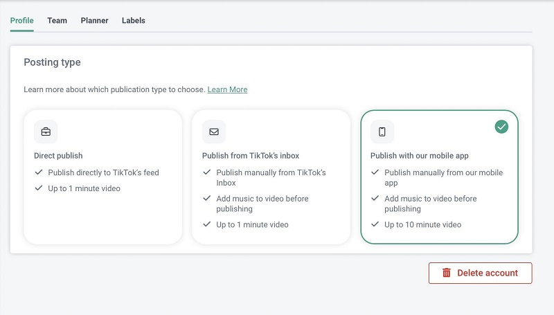 Warning! If you choose direct posting, you must re-log in to TickTock to grant permission to publish posts through the platform. It only applies to users who already have an account added to Onlypult. When adding new accounts, you can publish videos directly by default.