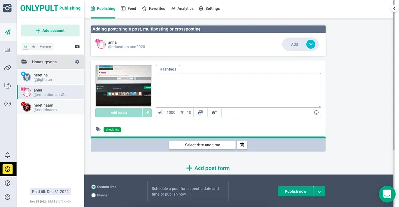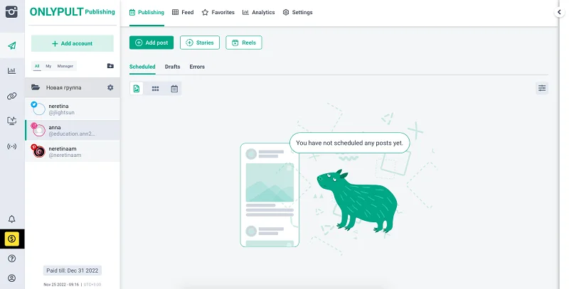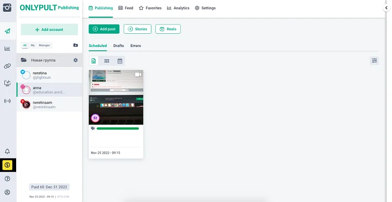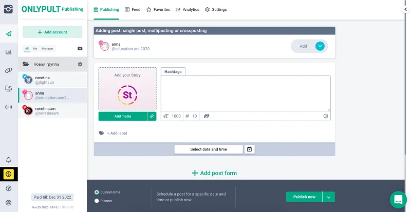 Go to your personal account. You can find all accounts linked to the profile in the Publishing tab. Select the Instagram icon and the account you want to publish Stories. The Add post, Stories, Reels buttons are on the top menu.