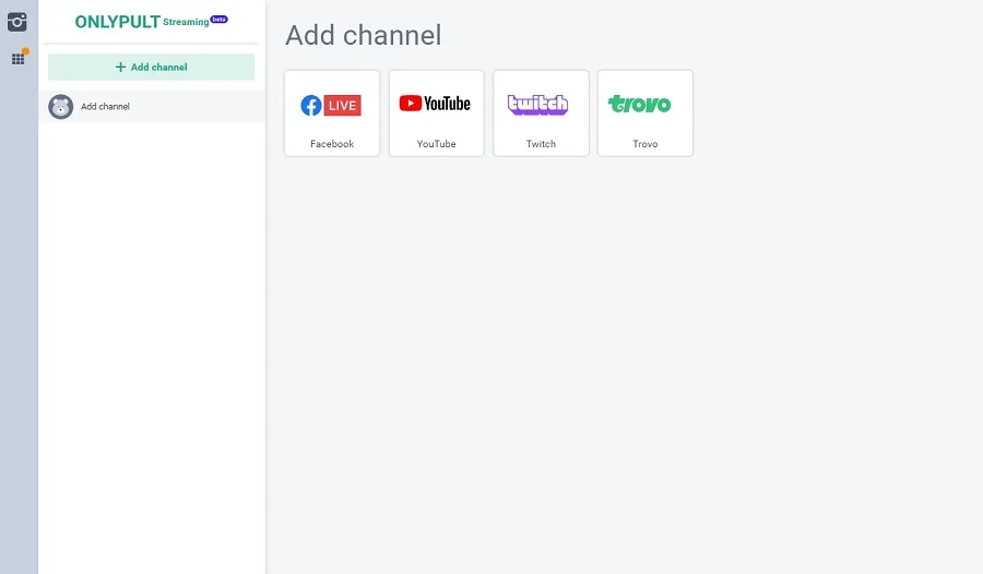 After selecting the Streaming tab, the menu will appear. Here you need to add one or more Facebook, YouTube, or Twitch channels (we will add other platforms later).