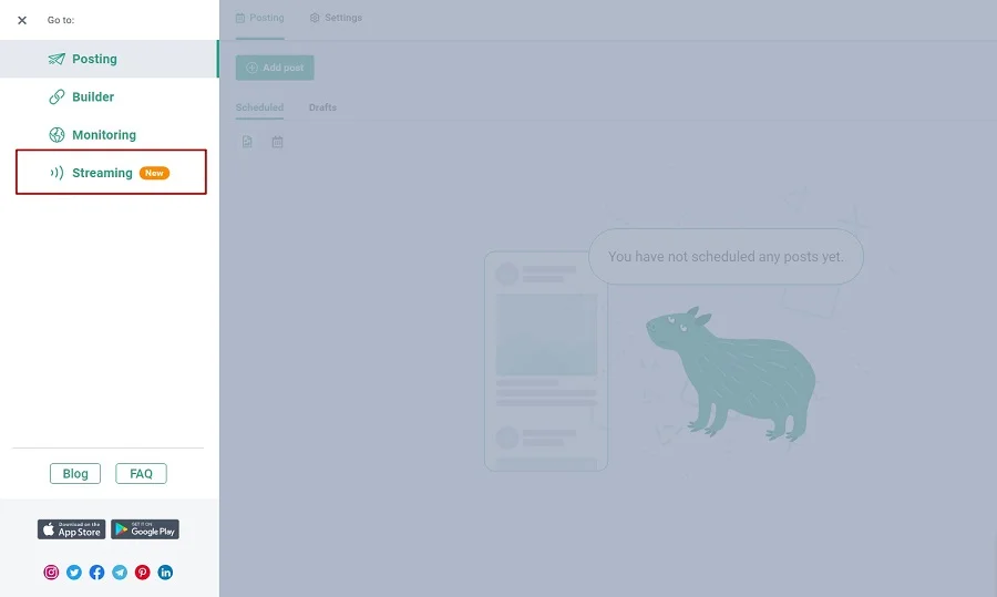 Then you will see the dashboard for posting. Click on the icon under the logo — and you will see the menu on the left with four Onlypult products, including Streaming.