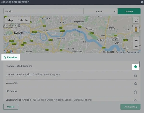 We have developed the feature of adding geotags to Favorites. To do that, you should find the location using the search bar and mark it with a star sign to add that geotag to the list.