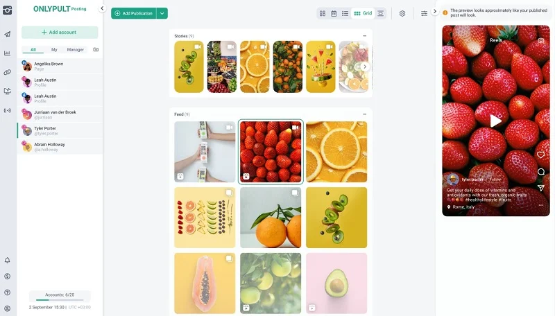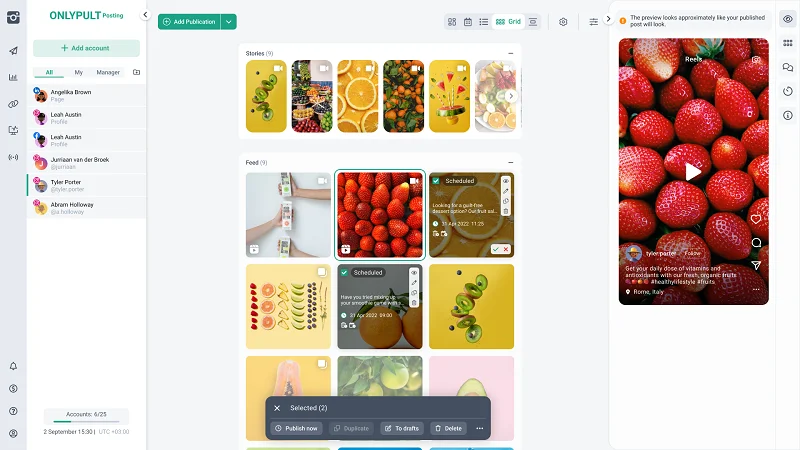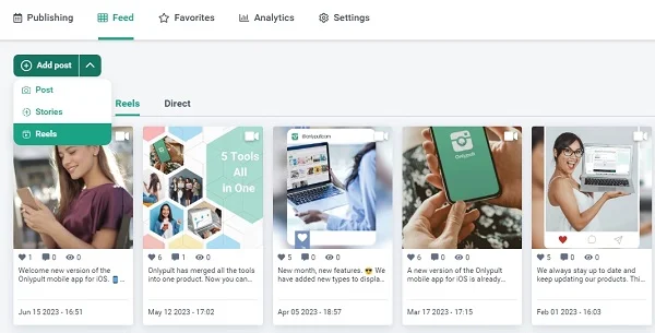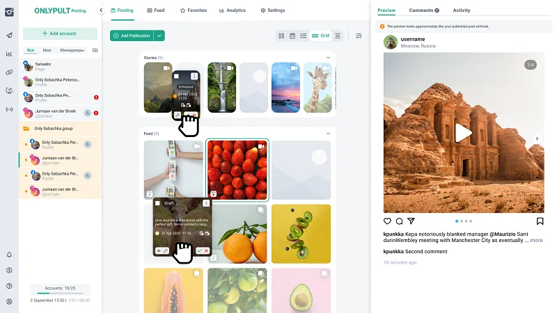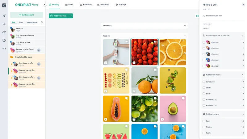 We’ve added filters and post sorting: by creation date; by status (Drafts, Scheduled); by publication type (posts, stories, reels); you can also add tags for each post type.
