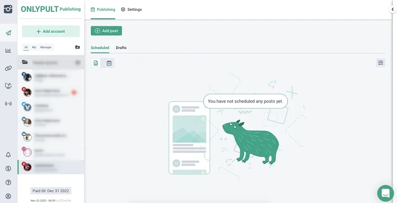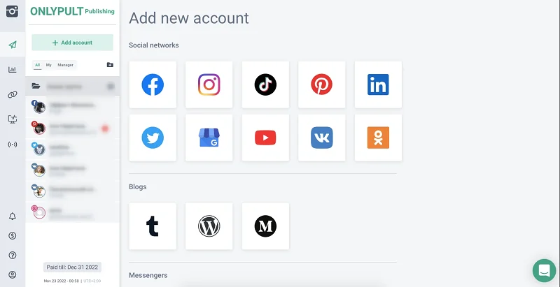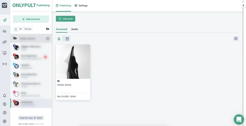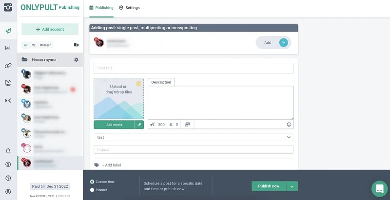 Posting new images to Pinterest has become possible through our platform. To do this, go to your personal account in the “Publishing” section and select the Pinterest application icon.