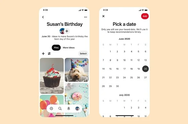 With an increase in the creation of boards focused on virtual activities (+50% from March to April), for example, virtual teaching and virtual celebrations, Pinterest decided to simplify the organization of boards. Now users can add notes to their board to list the ingredients for a recipe or keep tabs on projects and add dates to boards.