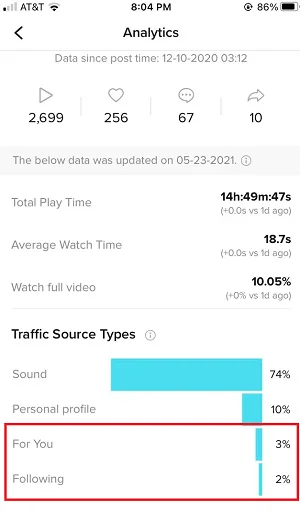 A way to detect this with certainty is available to pro account users with extended access to account analytics. Check the traffic sources for videos posted after you’ve noticed the change in engagement rates. With the shadowban in place, there will be no views coming from the For You page. Those with regular accounts can try using a hashtag or a sound to see whether the videos show up under them.
