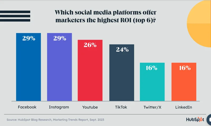 Social media channels are best for marketing and advertising. In fact, TikTok (24%) and Instagram (29%) are in the top six platforms offering digital marketers the highest return on investment (ROI).