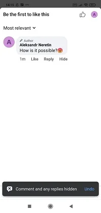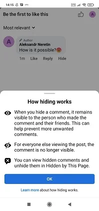 Keep in mind that the author of a comment or any other users might notice the absence of his comment and start asking questions. Do not forget to clarify your reasons for deletion and/or hiding: for instance, you might say that the comment was abusing or violating your community standards. If you had your reasons — be sure to voice them.