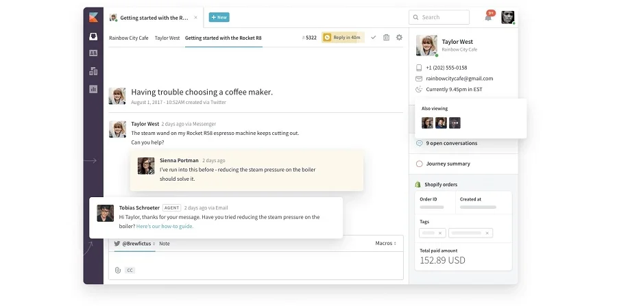 When it is required to answer the question of a very concerned client, it is pretty hard to communicate through all the channels at once. Kayako service can help you with it. It displays all the client requests from chats on websites, messengers, emails, and website request forms. The program saves all the requests, and even if a user writes on Facebook the first time and an email the second time, the client service team will have an opportunity to learn the exact path of the client.