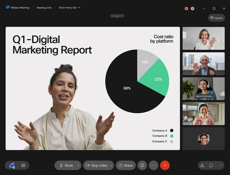 The first thing that grabs attention is an easy, user-friendly interface with a chat and quick emoji reactions. But the operation shows its main advantages. WebEx allows you to instantly switch between devices, for example, when your smartphone runs out of battery. The noise reduction level for voice transmission is one of the best among similar applications. Various visualizations — such as presentations — can be integrated into a video without screen sharing. The speaker looks the same as during an offline presentation.
