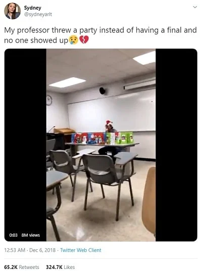 A post made as a homework task by students from Missouri gained unbelievable popularity. It shows a classroom decorated for a party and a couple of sad students behind their desks. The caption said: “My professor threw a party instead of having a final, and no one showed up.”
