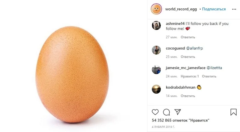 On January 4th, 2019 on Instagram, the account @world_record_egg was created. It contained a photo of a chicken egg, and its caption called to beat the record by the number of likes and to make the post the most popular in the world. The mischief worked well. In 10 days the egg got 18.4m likes, and there are more than fifty million likes now. The main principle here is to do something stupid.