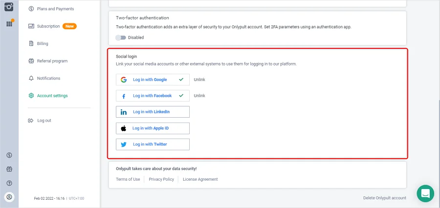 You can easily set logging in to the same Onlypult account with different social media profiles. It makes the process faster and more convenient. Just configure different authentication ways in the account settings