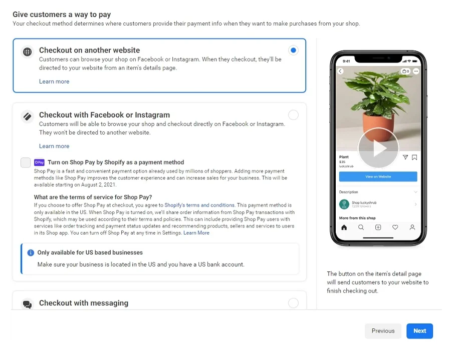 The first thing you’ll need to do is decide via which social network you’ll be selling — either Facebook or Instagram. The second step is to install a payment tool. Redirecting buyers to your website is a traditional solution. From 2021, businesses in the US can use direct payments on Facebook: buyers pay either with a bank card or via a Shopify account. Messenger is also available for making payments, but most users do not feel comfortable about this payment method.
