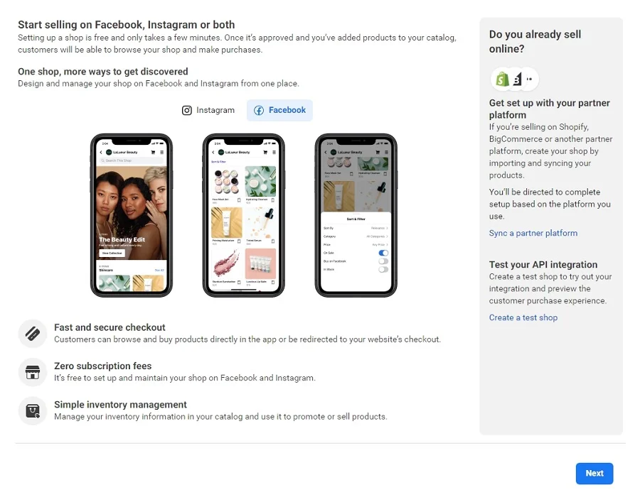 You must have a Facebook business account to create a shop. All the setup process is done at Commerce. Facebook developers did their best to ease the platform performance for businesses. The application interface and catalog setup are user-friendly, even for those new to online retail. The main features of a shop are described on the onboarding page.