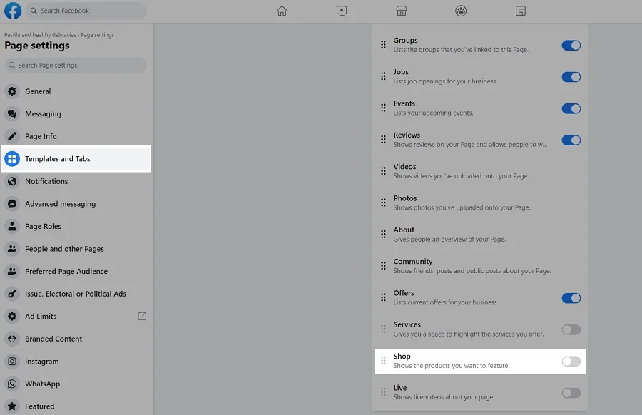 Go to Settings, choose Templates and Tabs, and enable the Shop feature — now it is displayed on the Facebook page. At this point, the Catalog tab will appear on your business account.