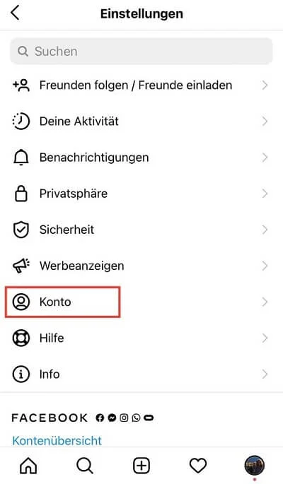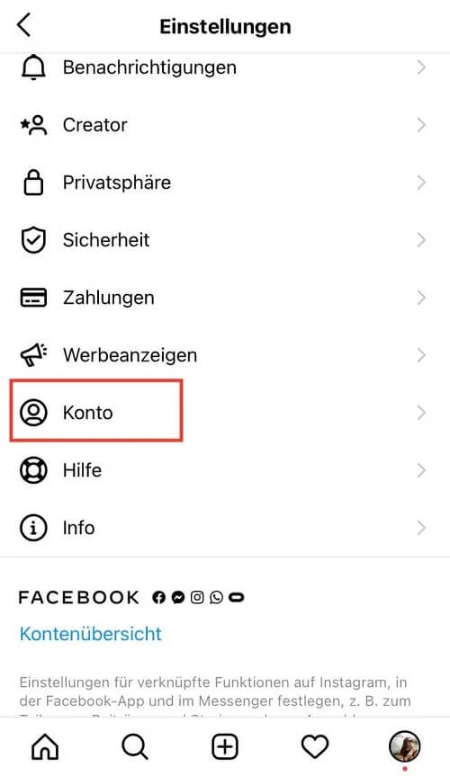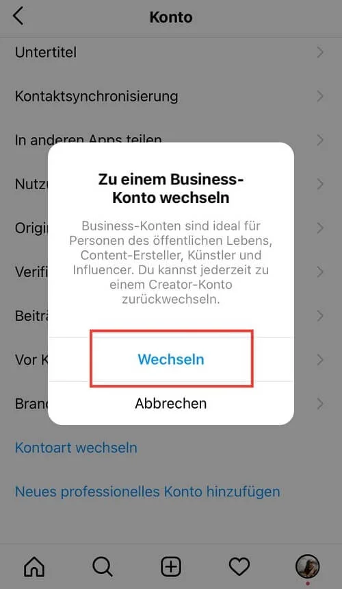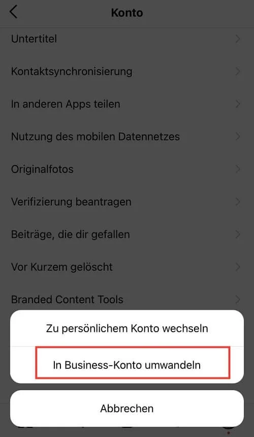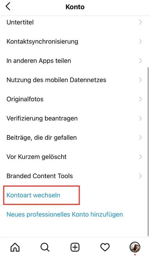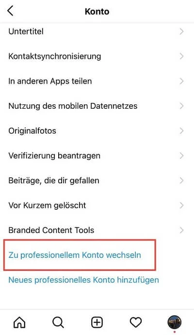 - Öffnen Sie die Instagram-Anwendung, gehen Sie zu den Einstellungen und wählen Sie “Konto” und dann die Option “Zum professionellen Konto wechseln”.