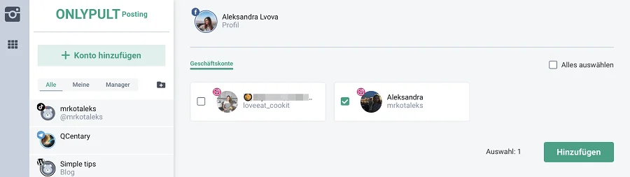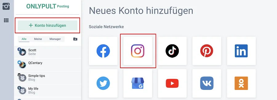 - Fügen Sie zunächst Ihr Instagram-Konto zu Onlypult hinzu:
