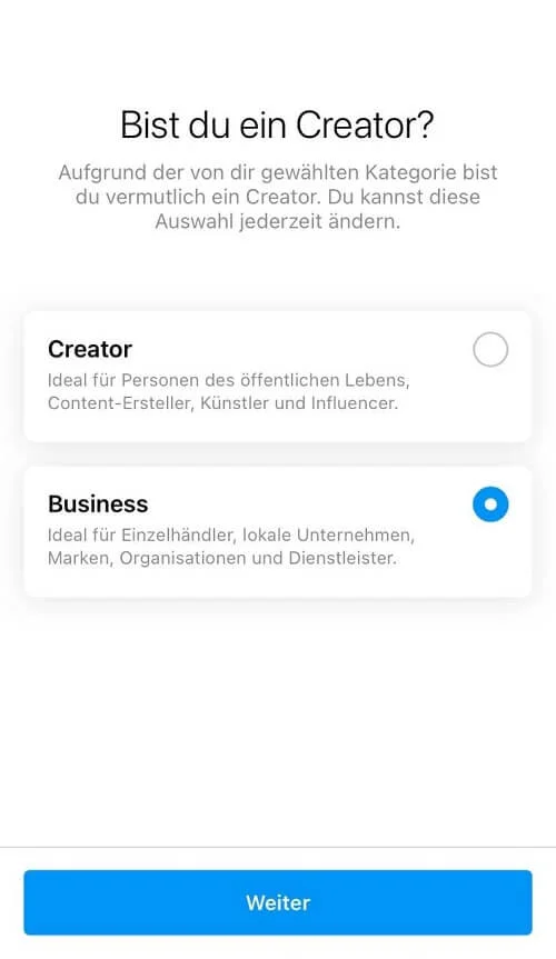 - Als nächstes wird Instagram kurz über die Vorteile des Übergangs sprechen und Sie bitten, die Kategorie Ihrer Aktivität anzugeben. Wählen Sie den Kontotyp “Geschäftlich”.