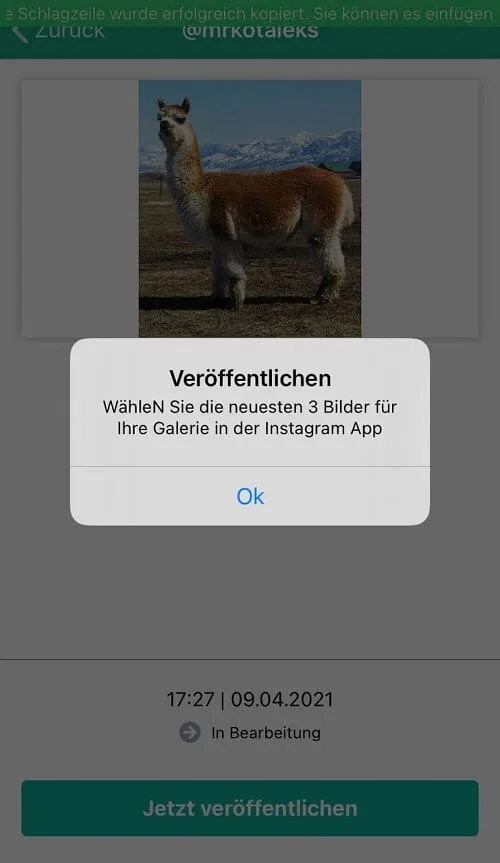 Wenn Sie eine Galerie (Karussell) planen, muss der Beitrag nach einer Push-Benachrichtigung veröffentlicht werden (wie das geht, wird unten beschrieben).
