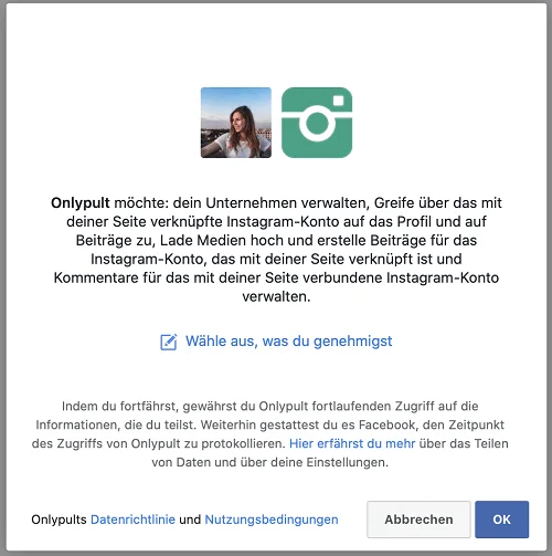 - Sie werden zur Facebook-Seite weitergeleitet, um den Zugriff auf die Onlypult-Anwendung zu bestätigen.