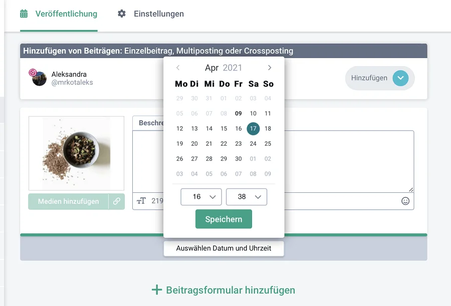 - Wenn der Inhalt des Beitrags vollständig ist, klicken Sie auf “Jetzt veröffentlichen”, wenn Sie den Beitrag sofort für Ihre Follower freigeben möchten, oder klicken Sie auf “Datum und Uhrzeit auswählen”, wählen Sie eine zukünftige Veröffentlichungszeit aus und klicken Sie auf “Planen”.