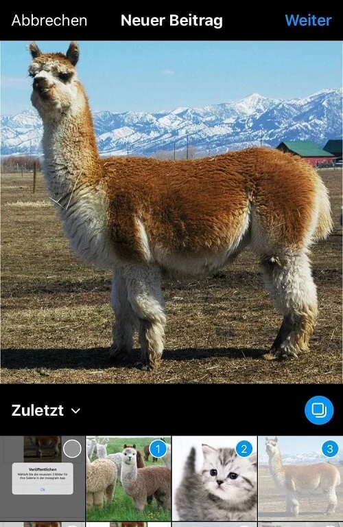 - Als nächstes öffnet sich automatisch die Instagram-Oberfläche und markiert die Dateien für das Karussell.