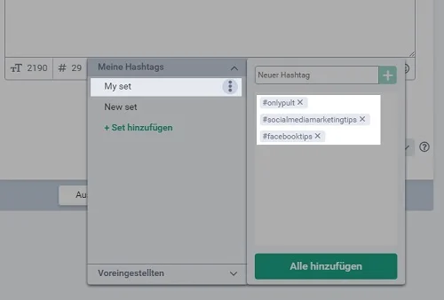 Fügen Sie den gesamten Satz auf einmal zum Beitrag hinzu oder wählen Sie einzelne Hashtags aus dem Satz aus.