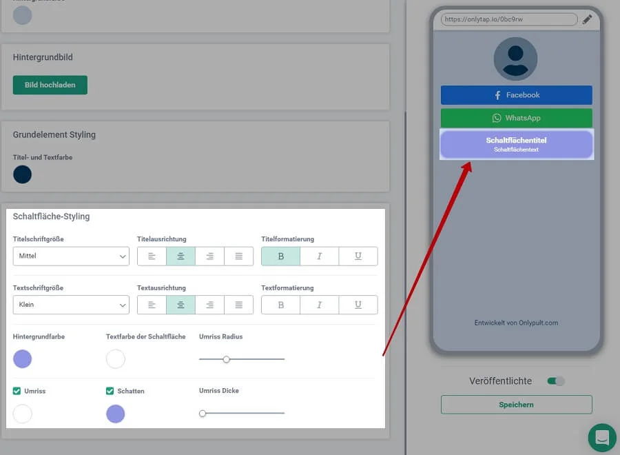 - Ausrichtung von Titel und Text, Formatierung, Dicke und Radius des Umrisses;