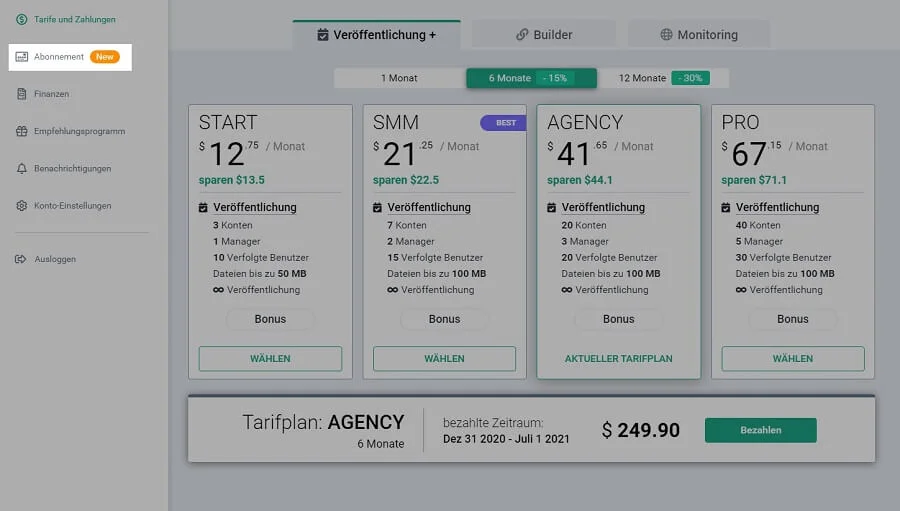 Sie können ein Abonnement im Abschnitt “Abonnement” aktivieren. Abonnementzahlungsdaten werden im Bereich “Finanzen” gespeichert.