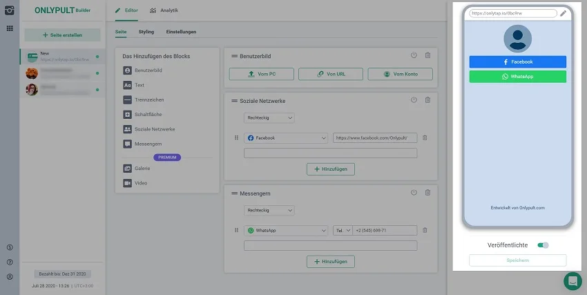 Das Menü auf der linken Seite mit all Ihren erstellten Seiten wird angezeigt, und jetzt können Sie schnell zwischen ihnen wechseln. Sie können auch sehen, welche von ihnen veröffentlicht wurden und welche nicht.