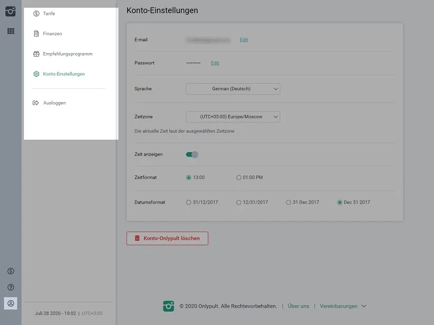 Jetzt können Sie auf das Menü Kontoeinstellungen und nützliche Abschnitte zugreifen, um mit unserer Plattform zu arbeiten, indem Sie auf die Schaltfläche