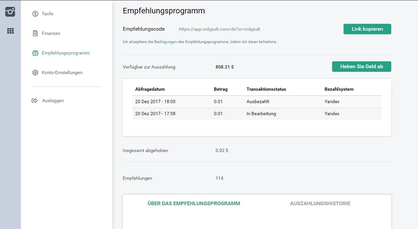 Alle Informationen zum Empfehlungsprogramm finden Sie im speziellen Bereich. Hier finden Sie die Bedingungen des Programms, alle Vorgänge, die Anzahl Ihrer Empfehlungen und das Geld, das zum Abheben zur Verfügung steht.