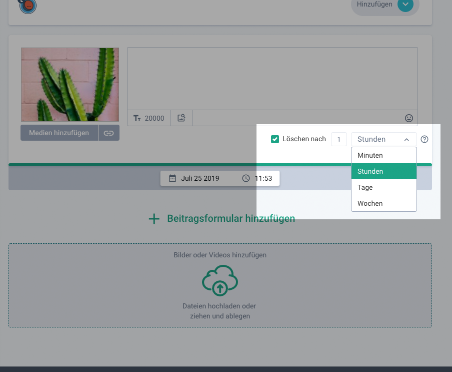 Beim Erstellen eines Beitrags können Sie auch die Zeit einstellen, nach der er automatisch aus dem Feed gelöscht wird. Diese Option kann hilfreich sein, wenn es sich um einen Werbebeitrag handelt oder als Teil einer kurzfristigen Kampagne veröffentlicht wird.