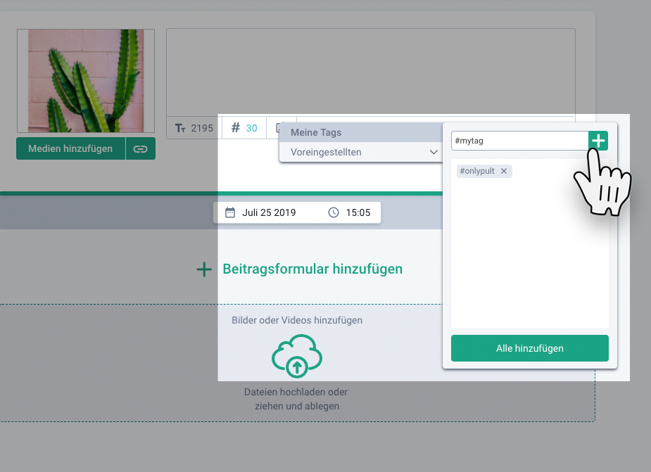 Klicken Sie auf das Symbol “#”, wählen Sie “Voreingestellten” aus, wählen Sie eine Kategorie aus und klicken Sie auf den gewünschten Hashtag. Dieser wird im Beitrags-Formular angezeigt.