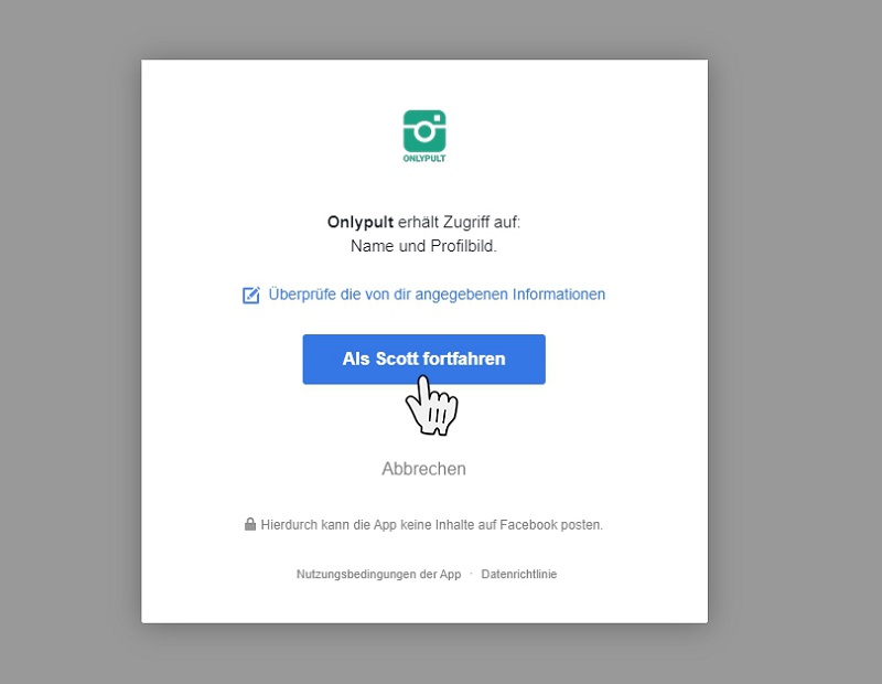 Es erscheint ein Fenster, in dem angeboten wird, der App die Rechte zum Zugriff auf den Profilnamen und das Bild zu erteilen. Klicken Sie auf “Fortzufahren”.