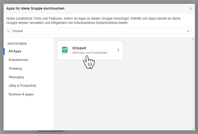 - Geben Sie “Onlypult” in die Suchleiste des angezeigten Fensters ein, wählen Sie Apps aus und drücken Sie im nächsten Fenster auf “Hinzufügen”.