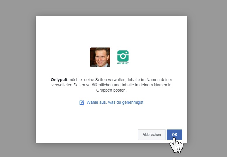 - Daraufhin wird ein Fenster angezeigt, in dem Sie die Rechte für die App erhalten, um Ihre Seiten zu verwalten, im Namen Ihrer Seite zu veröffentlichen und in Ihrem Namen in Gruppen zu veröffentlichen.