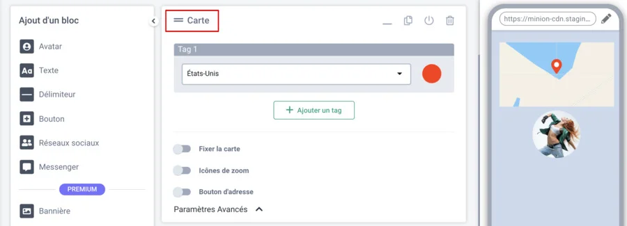 Ahora puede agregar un mapa a su página en el Builder y fijar hasta 10 tags con direcciones. La función sólo está disponible para las tarifas de pago.