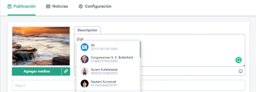 Ahora usted puede agregar páginas y usuarios a una publicación de Facebook directamente desde Onlypult. Comience a escribir el nombre de la página y seleccione el deseado en el menú emergente.