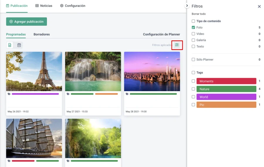 Filtro avanzado por tipo de publicación, contenido y etiquetas. Filtre y procese sólo las publicaciones que usted necesita.