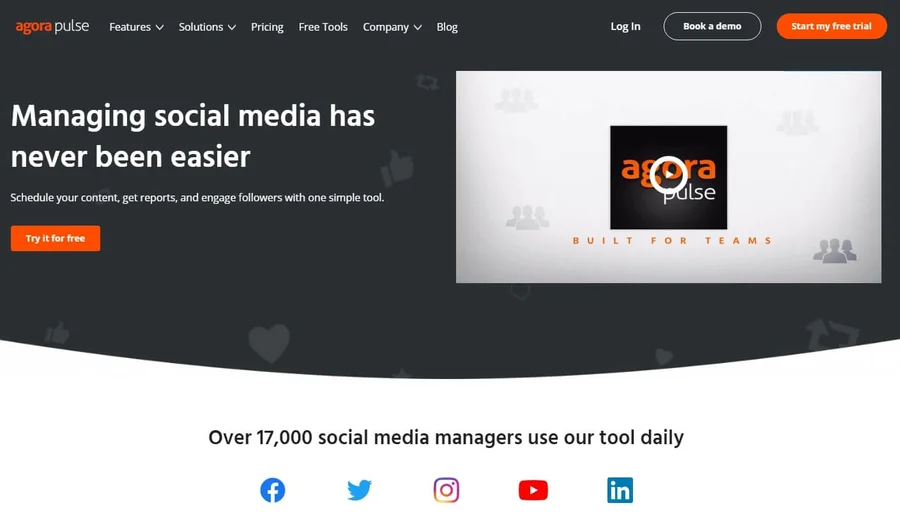 Descripción: Agora Pulse consolida múltiples cuentas de redes sociales en un panel de control. El sistema de bandeja de entrada se asegura de que nunca se pierda un tweet, comentario o mensaje. De esta manera, siempre puede reaccionar rápidamente a todas sus interacciones online.