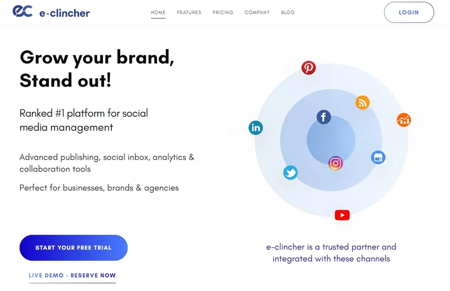 Descripción: eClincher ofrece funcionalidades similares inherentes a las herramientas de administración de redes sociales descritas anteriormente. Hay paneles de redes sociales para Facebook (perfiles, páginas y anuncios), Instagram (personal y empresarial), Pinterest, YouTube y algunos otros servicios. También proporciona informes de inteligencia competitiva para Twitter, Facebook e Instagram.