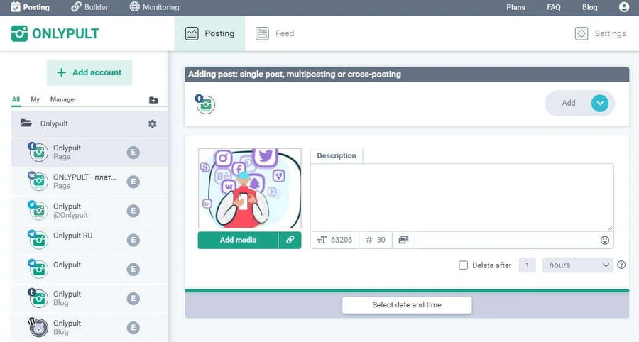 Descripción: Onlypult es una herramienta automatizada que ofrece la funcionalidad para planificar y programar publicaciones en Instagram. Ayuda a los administradores de redes sociales a automatizar el contenido futuro, obtener suscriptores, engagement y optimización de análisis, suscribirse a competidores e influir en el comportamiento, y mucho más. El contenido se publica en un día y hora predeterminados. Además, Onlypult admite la carga masiva, lo que es especialmente útil cuando el administrador se dedica a otras tareas o se va de vacaciones.