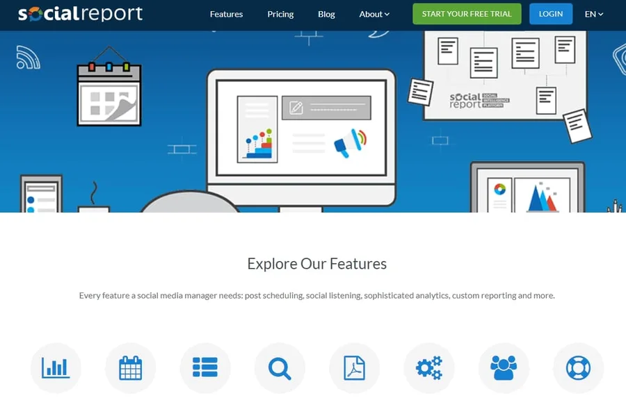 - Soporte multi-idioma. Social Report admite alemán, griego, húngaro, italiano, holandés, portugués, español, rumano, ruso y malayo.